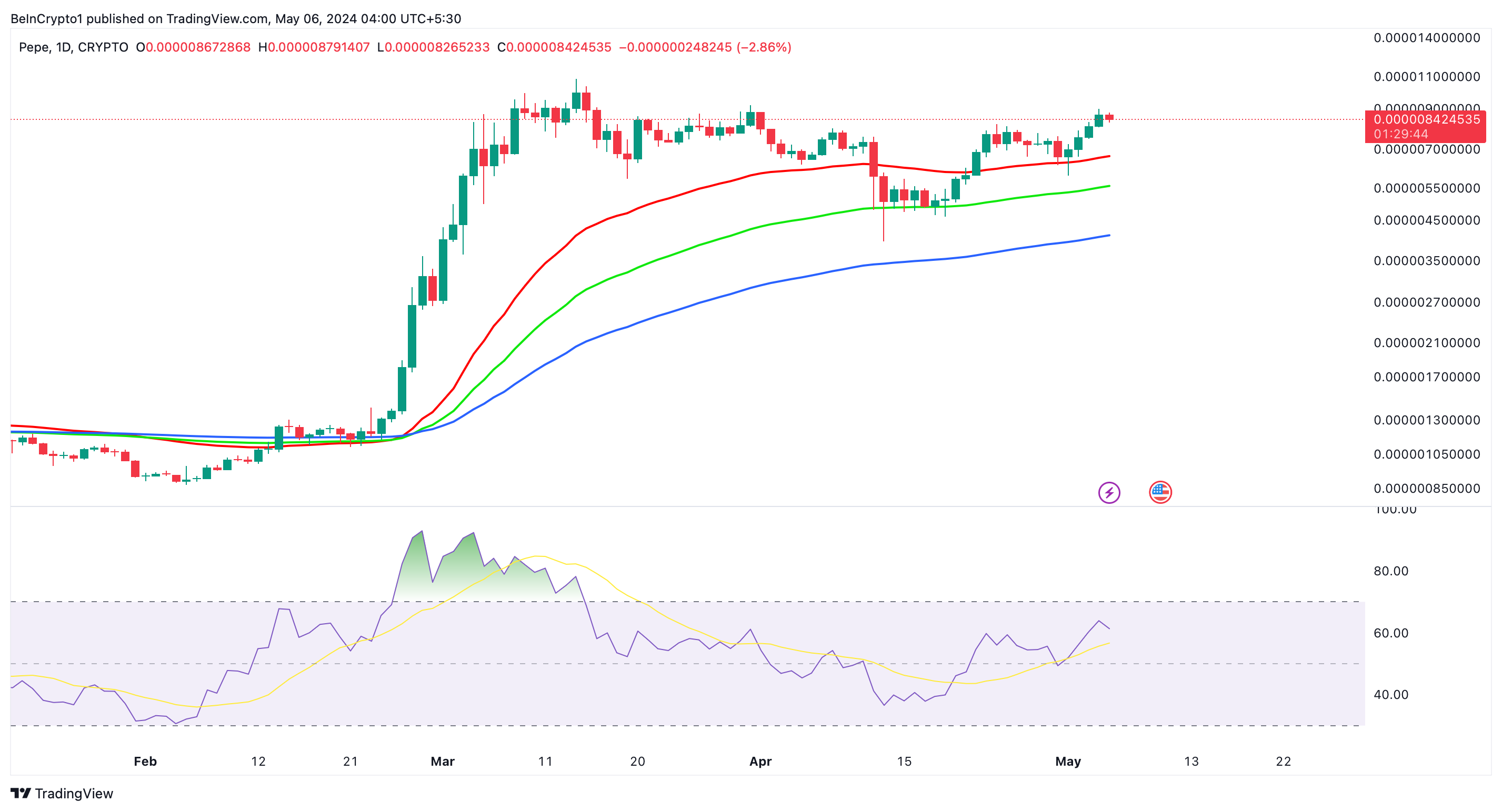 В настоящее время PEPE демонстрирует многообещающую динамику. За последний месяц монета-мем взлетела на 29,70%: мемкоин торгуется выше 50-дневной простой скользящей средней, а здоровый индекс относительной силы 62,78 указывают на стабильные рыночные настроения, укрепляя доверие инвесторов.