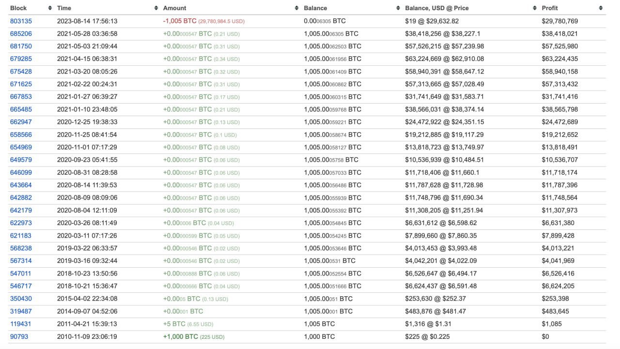 По данным BitInfoCharts, стоимость 1000 полученных им в ноябре 2010 года биткоинов составляла $225. В апреле 2011 года на адрес поступило еще 5 BTC. На данный момент эта скромная сумма превратилась в $29,75 млн.