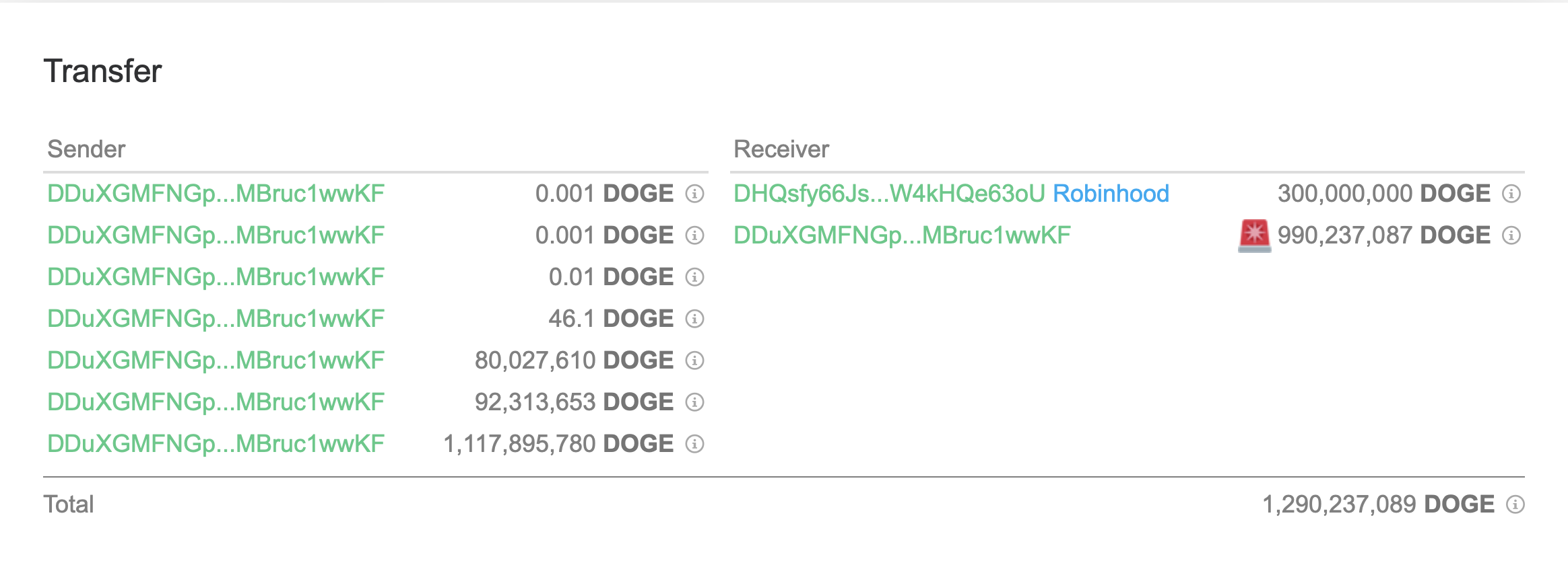 Согласно данным криптотрекера Whale Alert, совсем недавно неизвестный кит DDuXGruc1wwKF перевел 300 млн DOGE на Robinhood.