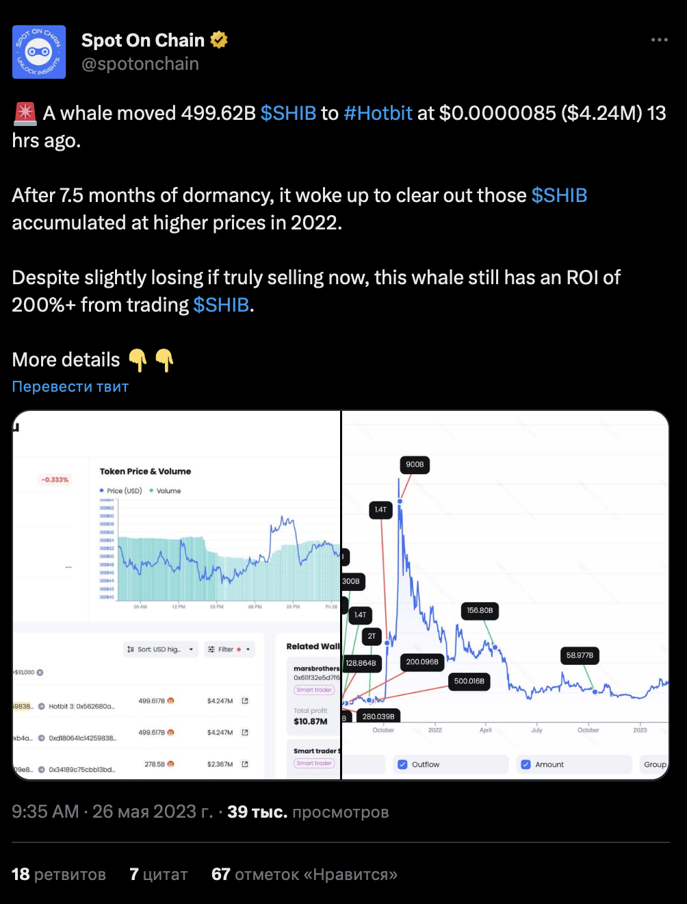 После семи с половиной месяцев бездействия кит Shiba Inu перевел 500 млрд монет на недавно прекратившую свою деятельность криптобиржу Hotbit. Об этом сообщил пользователь «Твиттера» @Spot On Chain, отметив, что адрес принадлежит одному из первых держателей SHIB.