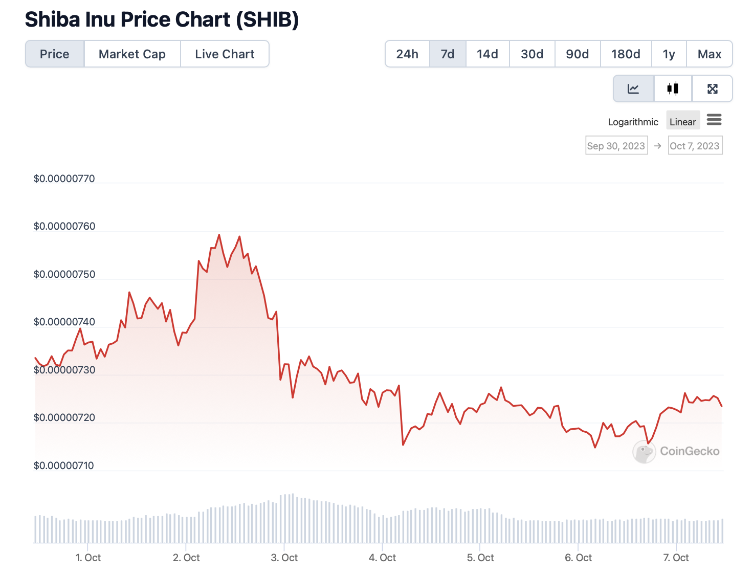 Хотя действия крупных инвесторов часто оказывают влияние на цену актива, на этот раз цена Shiba Inu практически не отреагировала на многомиллионный перевод. На момент написания мемкоин торгуется на отметке $0,00000724, прибавив за последние 24 часа 0,8%.