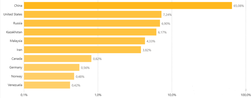 Согласно приведенным в отчете данным, хэшрейт в Китае стремительно сокращается. Начиная с сентября 2019 года, этот показатель упал с 75.63% до 65.08%, в то время, как в США хешрейт, наоборот, вырос до 7.24%. Аналитики TokenInsight ссылаются также на материалы Кембриджского университета по альтернативным финансам, который исследует показатели хешрейта в различных странах мира. Как видно на карте, США постепенно увеличивает свое присутствие на майнинговом рынке. А третье место по показателям хешрейта заняла Россия.