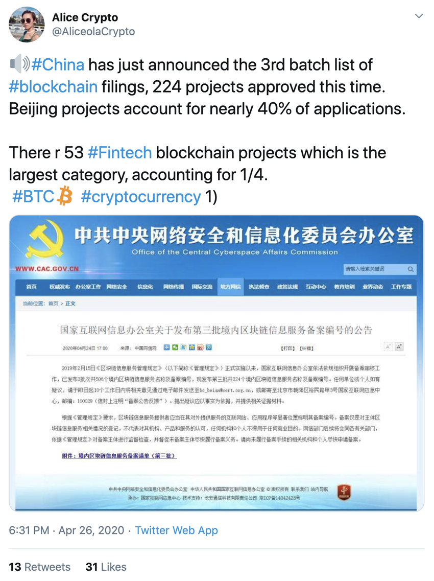 По закону все блокчейн-проекты, запускаемые в Китае, должны быть включены в национальный реестр, а для этого им необходимо получить одобрение властей. В последнее время Пекин явно доброжелательно настроен в отношении подобных заявок от компаний. Совсем недавно власти страны санкционировали разработку еще 224 проектов.