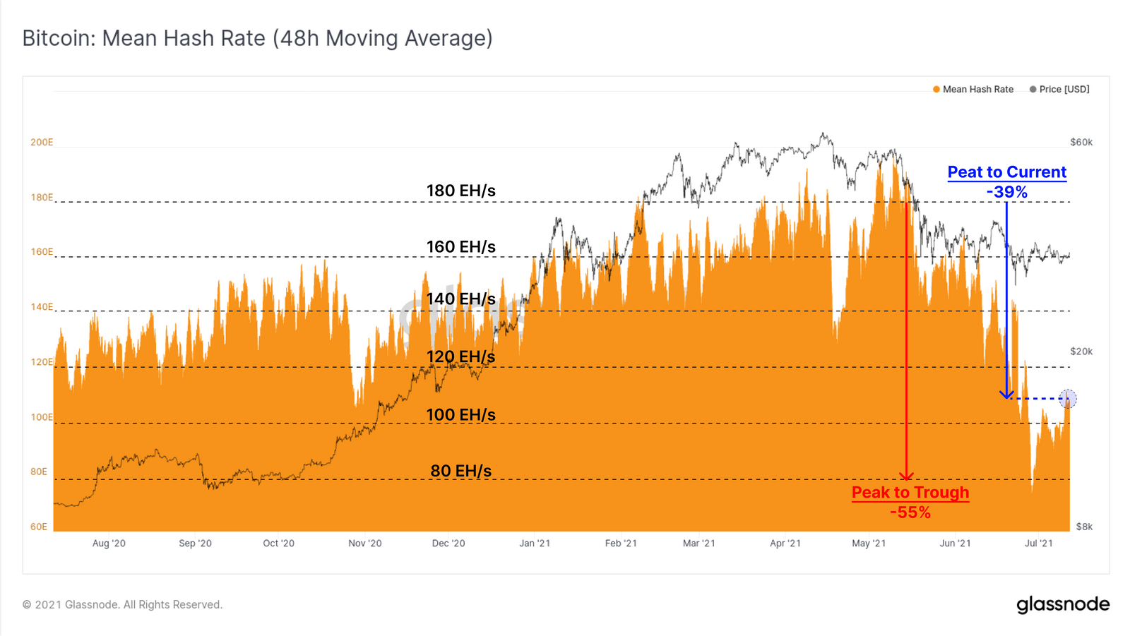 Отскок хешрейта биткоина может говорить о завершении переезда майнеров из Китая. К такому выводу пришли аналитики ресурса Glassnode. После того, как Китай открыто начал выгонять майнеров из страны, усредненный суточный хешрейт сети биткоина обвалился ниже 80 экзахэш в секунду.