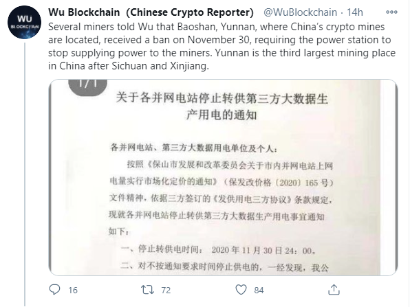 Sponsored“Несколько майнеров сообщили Ву, что 30 ноября электростанции Баошаня в провинции Юньнань получили распоряжение прекратить подачу электроэнергии для майнеров, – написал Ву у себя в твиттере, приложив скрин постановления.