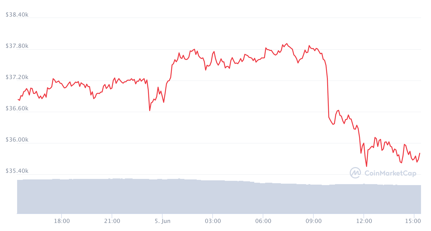 Биткоин моментально упал на 3%. Текущий внутридневной минимум — $35 466 по версии CoinMarketCap. Альткоины отреагировали сдержанно: ETH за сутки подешевел на 1,3%, а Binance Coin и Dogecoin выросли на 1,8% и 2,3% соответственно.