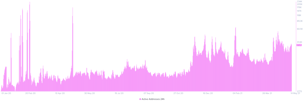 Вместе с кошельками растет и ончейн-активность. Число активных кошельков в суточном выражении по сравнению с прошлым годом выросло в десять раз до ~20 тыс. кошельков.