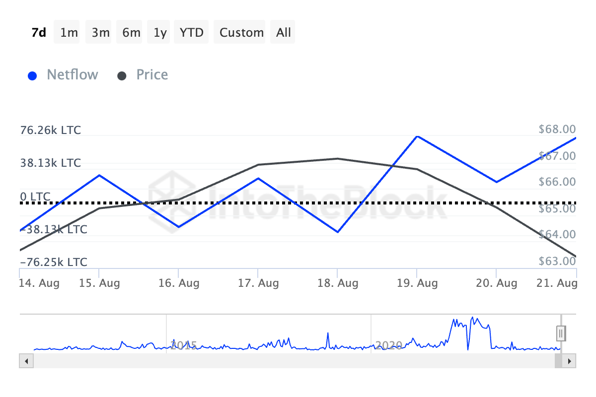 Согласно данным аналитической платформы IntoTheBlock, за последние 7 дней чистый приток крупных держателей Litecoin увеличился на 141%. В эту категорию попадают адреса с балансом более 0,1% от оборотного предложения актива. Чистый приток отслеживает разницу между покупками и продажами этих кошельков.