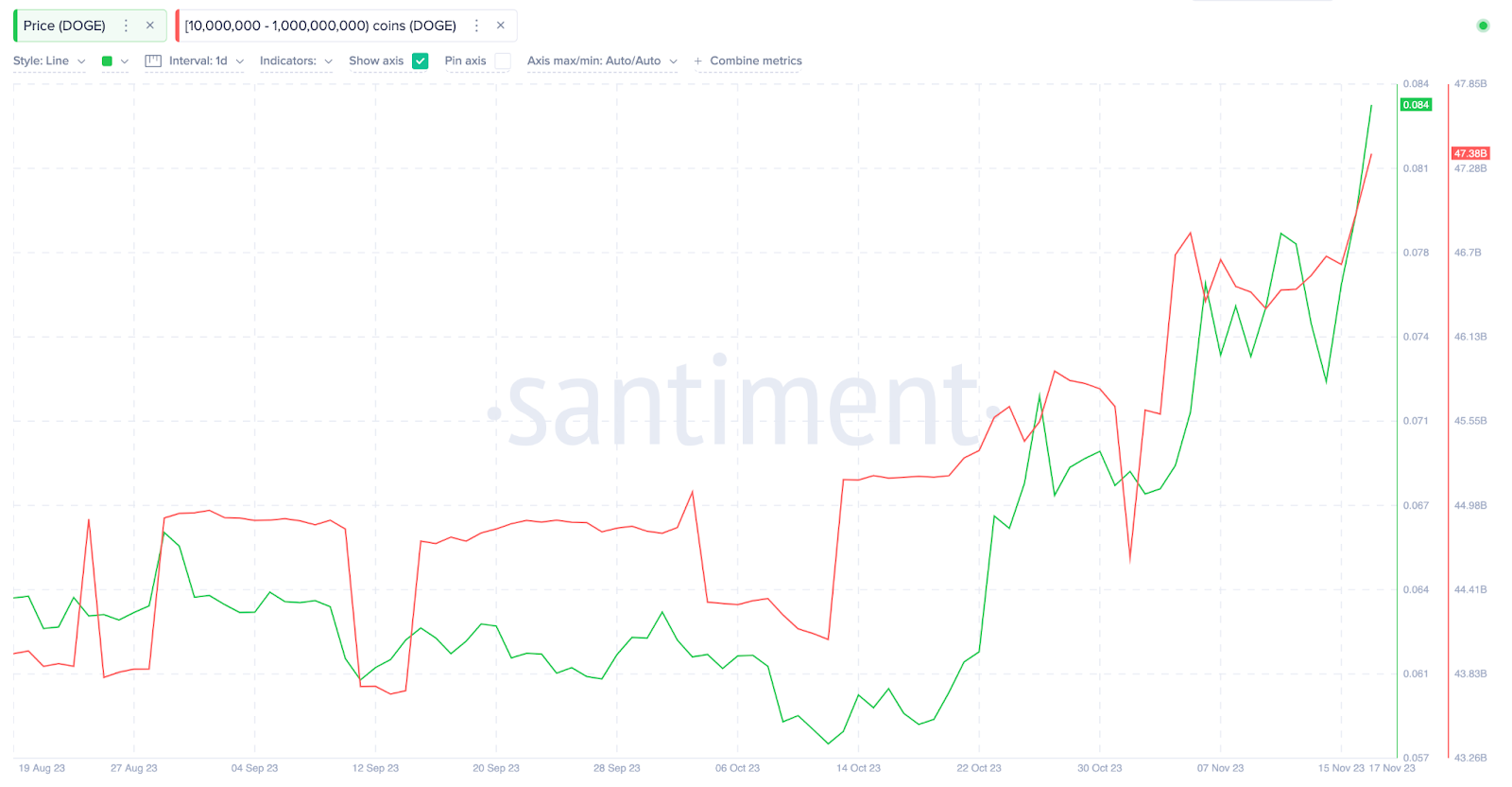 Ончейн-данные показывают, что ключевую роль в этом ралли сыграла группа китов с балансами от 10 млн до 1 млрд монет. Как показано на приведенном ниже графике Santiment, в период со 2 по 17 ноября они приобрели еще 2,75 млрд DOGE. По текущей цене в $0,09 стоимость купленных китами токенов составляет около $230 млн.
