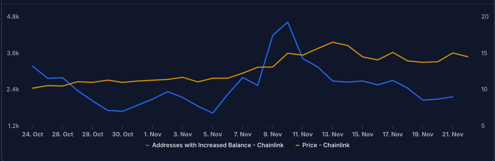 Однако интерес к Chainlink теряют не только киты. Согласно данным трекера TheTie, 10 ноября LINK приобрели 4610 адреса. К 20 ноября покупки совершили только 2150 кошельков. Это означает, что общий покупательский спрос снизился на 53%.