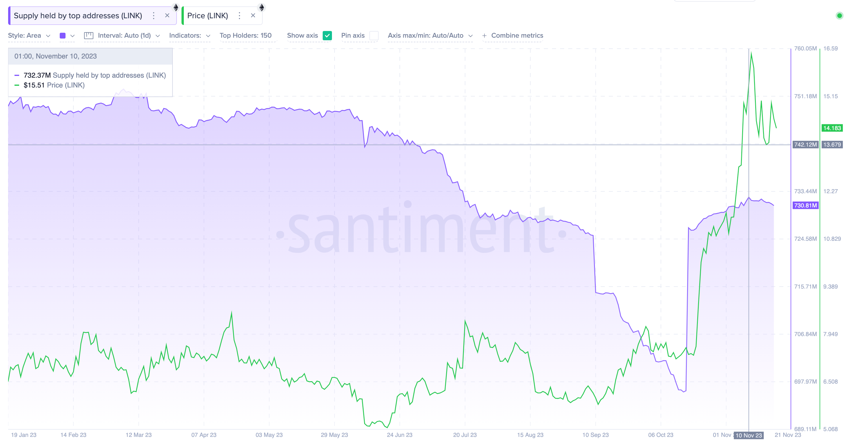 В период с 17 октября по 11 ноября цена Chainlink взлетела на 130%. Ключевую роль в этом ралли сыграли 150 крупнейших держателей токенов: всего за 3 недели они приобрели 36,07 млн LINK и довели свой совокупный баланс до пика в 732,37 млн монет. Однако после того, как цена актива достигла максимума в $16,60, они значительно ослабили покупательское давление.