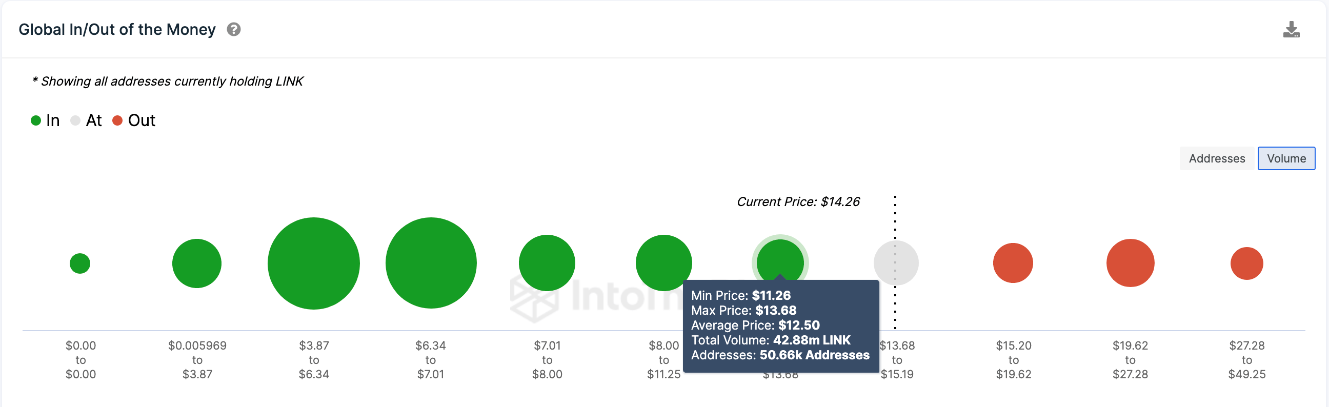Этот прогноз подтверждается и данными Global In/Out of the Money, которые группируют текущие адреса держателей LINK в соответствии с ценами входа в позиции.