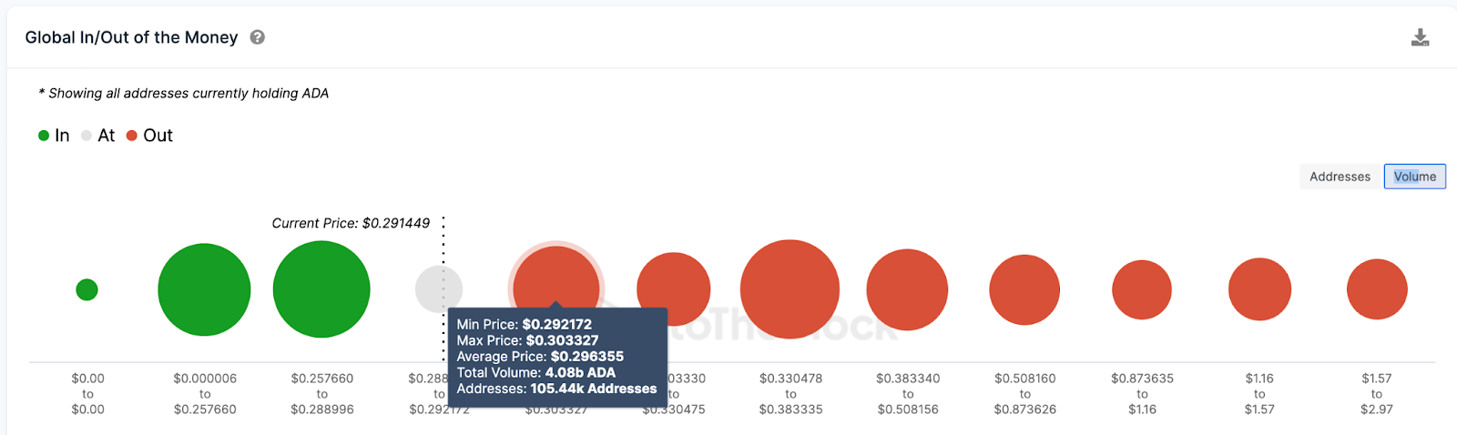 На графике ниже показано, что сопротивление активу оказывают 105 440 адресов, купивших 4,08 млрд ADA по максимальной цене $0,30. Если быки разовьют достаточно сильный импульс, им удастся прорваться к отметке $0,35.