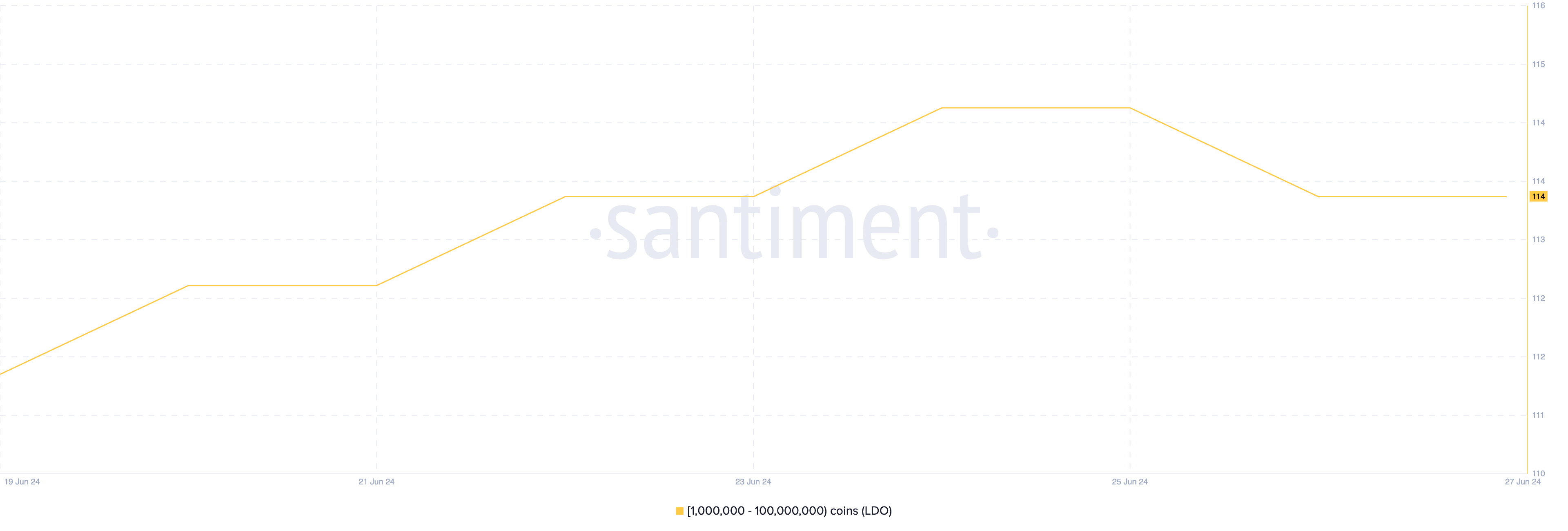 Не далее как 15 июня их количество упало до минимального за текущий год числа 111 адресов. Однако свежие новости на тему ETH-ETF побудили этих инвесторов нарастить покупки LDO за последнюю неделю.
