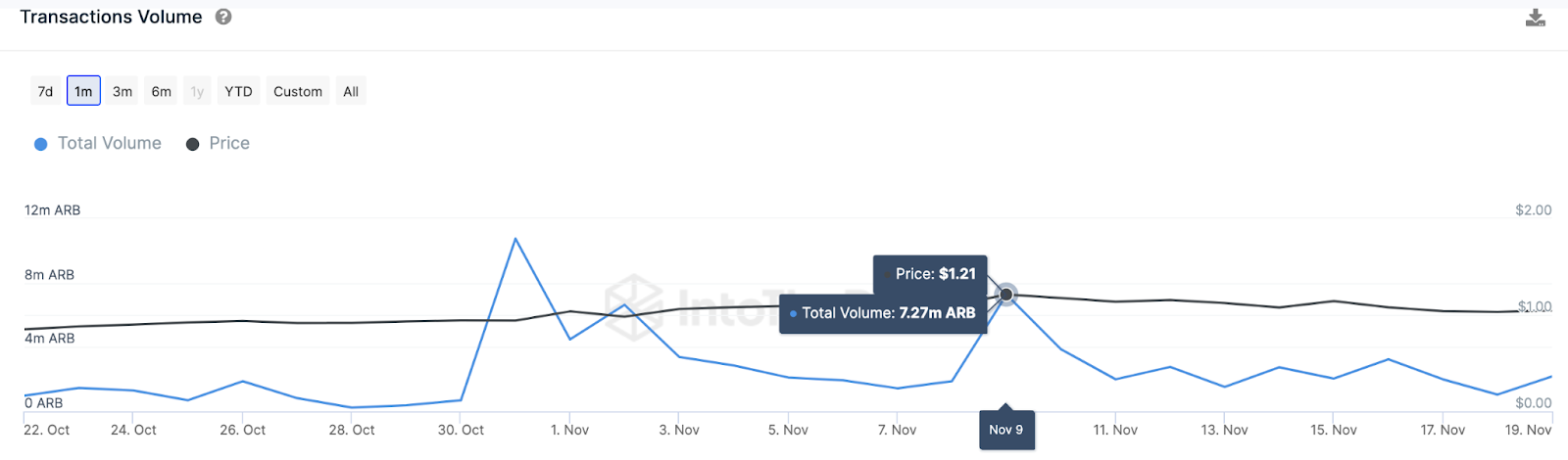 Подтверждением медвежьей позиции, высказанной выше, можно считать и падение спроса розничных инвесторов на Arbitrum. По данным аналитической платформы IntoTheBlock, в период с 9 по 19 ноября объем транзакций с ARB снизился на 70% — с 7,27 млн до 2,18 млн токенов.