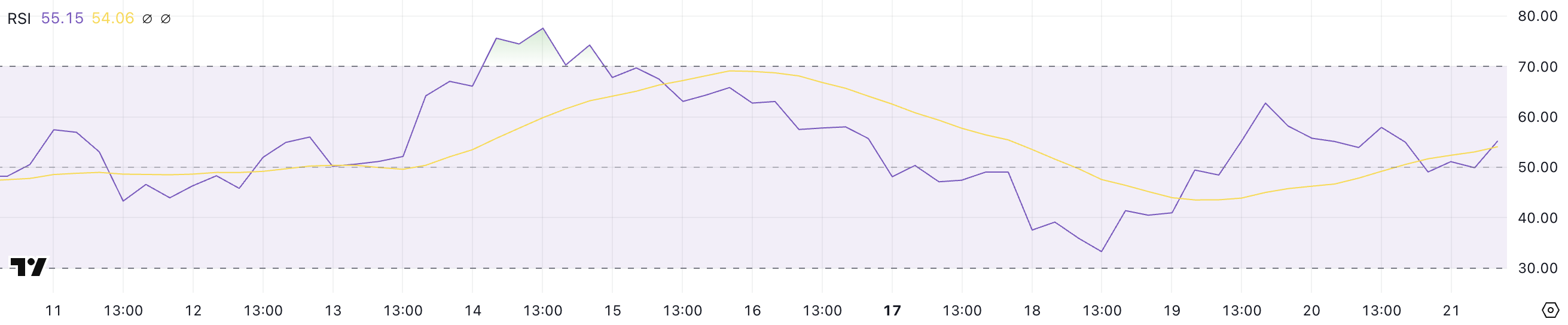 Текущее значение 55,1 находится чуть выше нейтральной зоны, что указывает на небольшой перевес покупателей. Если RSI опустится ниже 50, это может сигнализировать об ослаблении импульса и возможном снижении цены.