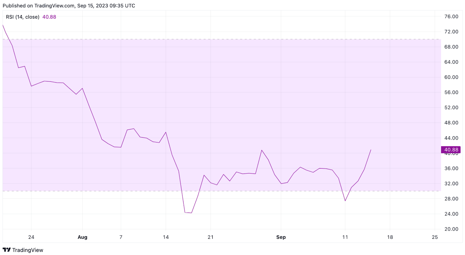 Текущая динамика индекса относительной силы (RSI) также намекает на возможность скорой смены тренда на восходящий. На приведенном ниже графике видно, что он закрепился выше критической отметки 30, достигнув 15 сентября уровня 40,88.