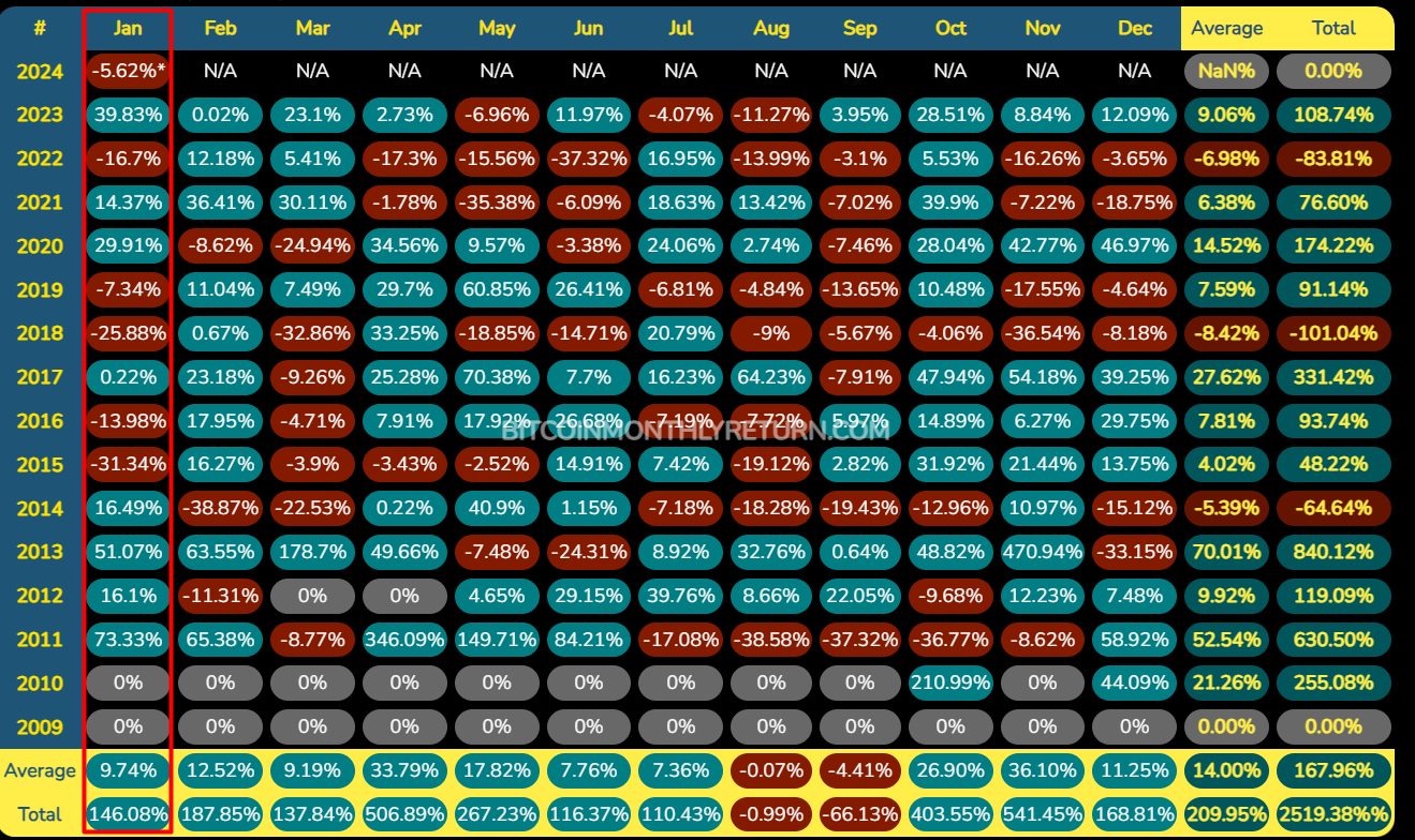 Похожий прогноз дал разработчик обучающих курсов по трейдингу криптовалютами и безопасности при использовании криптовалютных площадок Семен Назарук. Наш собеседник отметил, что исторически биткоин показывал слабые результаты в январе, и есть основания полагать, что так будет и в этот раз.