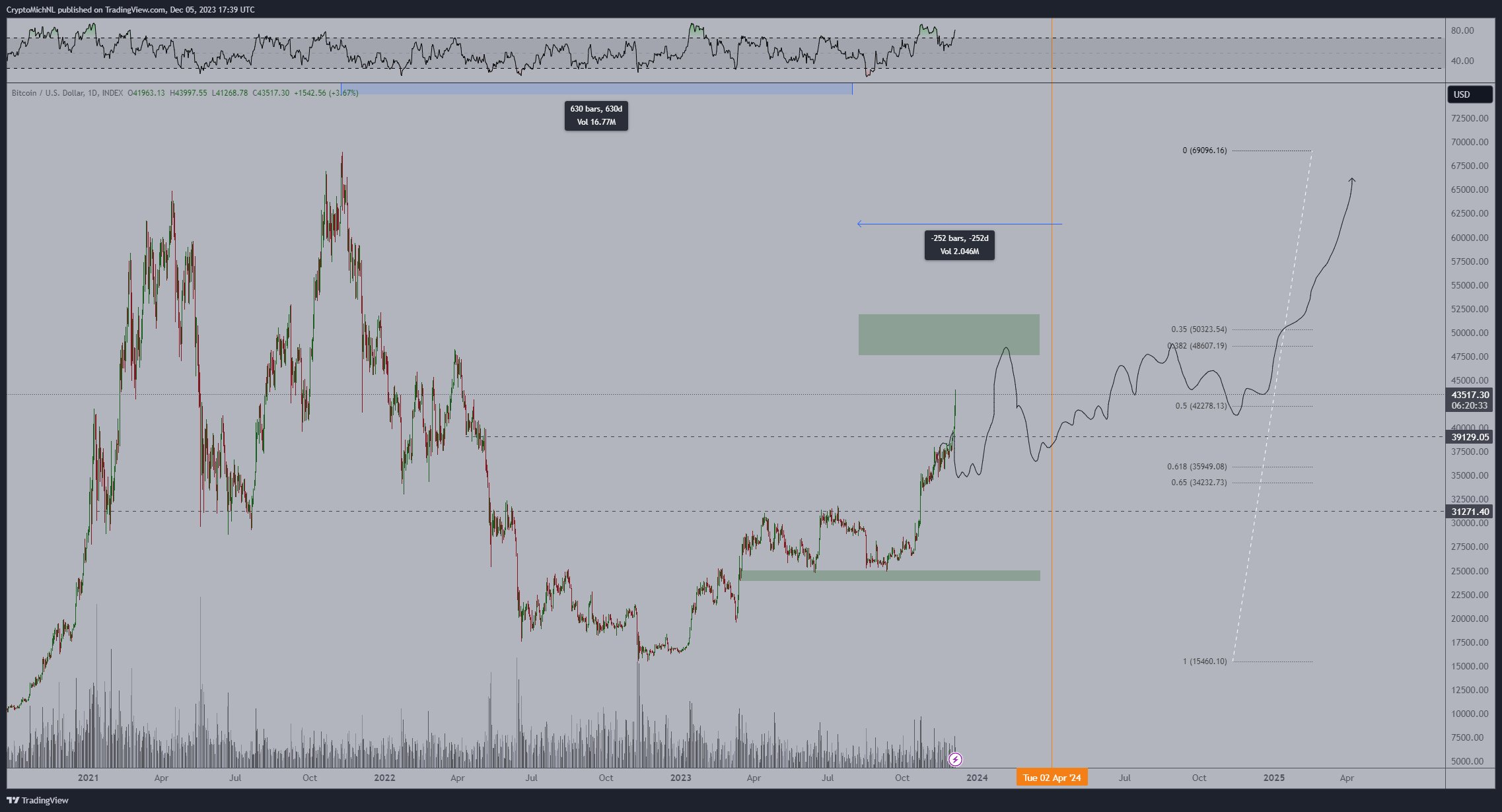 SponsoredПохожий прогноз биткоина дал аналитик Майкл ван де Попп. Судя по обозначенной им на графике траектории, он ждет коррекцию BTC в район $35 тыс. в ближайшее время. Следующая волна роста, по его мнению, может быть зафиксирована в начале 2024 года. В январе аналитик ждет биткоин по $50 тыс., затем новую волну коррекции и постепенное движение к обновлению абсолютного максимума в 2025 году.