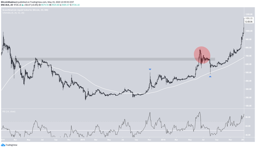 Обращает на себя внимание один комментарий трейдера к графику. Он полагает, что максимум, достигнутый в июне 2016 года, соответствует текущему ходу цены в рамках нынешнего цикла. Давайте внимательнее рассмотрим этот момент.
