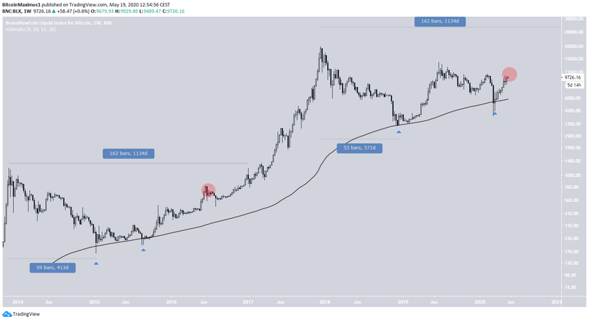 После того как в 2013 году биткоин отметил исторический максимум, у него ушло 1134 дня на то, чтобы побить собственный рекорд. Если ситуация снова повторится, очередное обновление максимума произойдет в 2021 году.