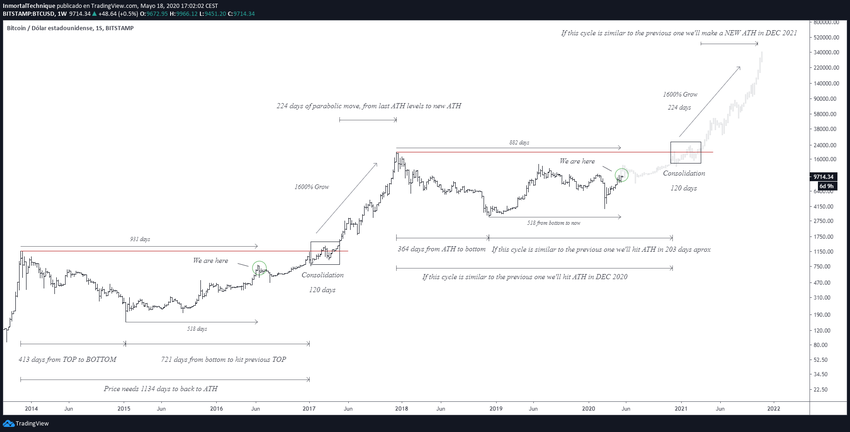 Популярный криптовалютный трейдер Inmortal technique (@Inmortalcrypto) поделился со своими читателями графиком биткоина, сравнивающим текущую коррекцию с предыдущей. Трейдер пишет, что если исходить из предположения, что прошлый цикл повторится (он подчеркивает, что это всего лишь предположение), то можно определить примерные сроки очередного обновления исторических максимумов по ВТС.