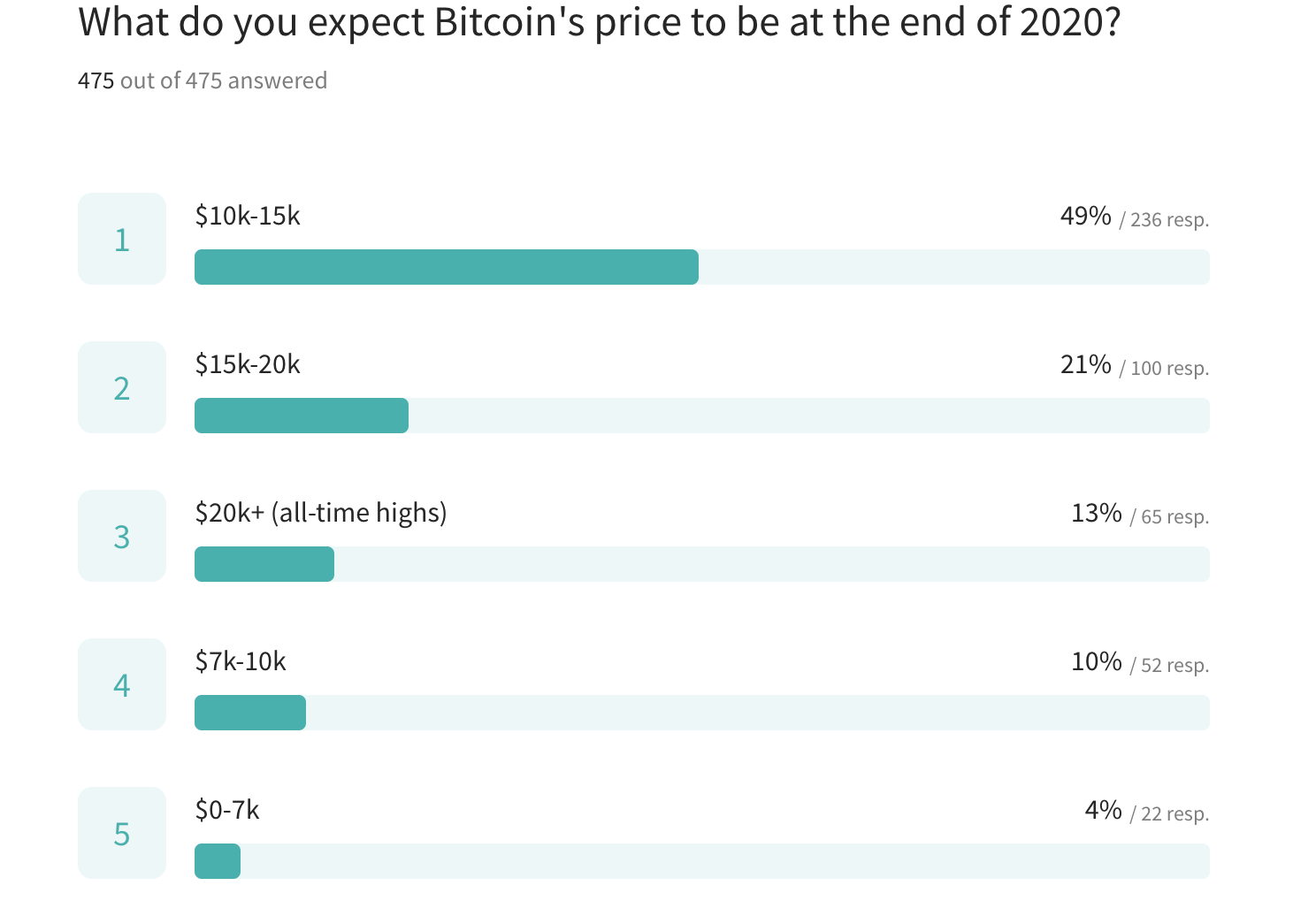 Что касается цен на биткоин, то абсолютное большинство респондентов склоняются к тому, что цена монеты будет колебаться в пределах от 10 000 до 15 000 долларов до конце года.