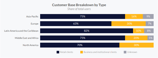 Согласно данным, распределение инвесторов в различных странах мира неравномерное. И если Европа и Северная Америка нацелены на развитие институциональных инвестиций в криптовалюты, то в странах Латинской Америки и Карибского бассейна, наоборот, фокус смещен на розничных инвесторов.