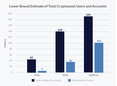 Всего за два года количество пользователей криптовалюты увеличилось в 3 раза : с 35 млн в 2018 году до 101 млн. в третьем квартале 2020 года. Эксперты уверены, что это не предел.