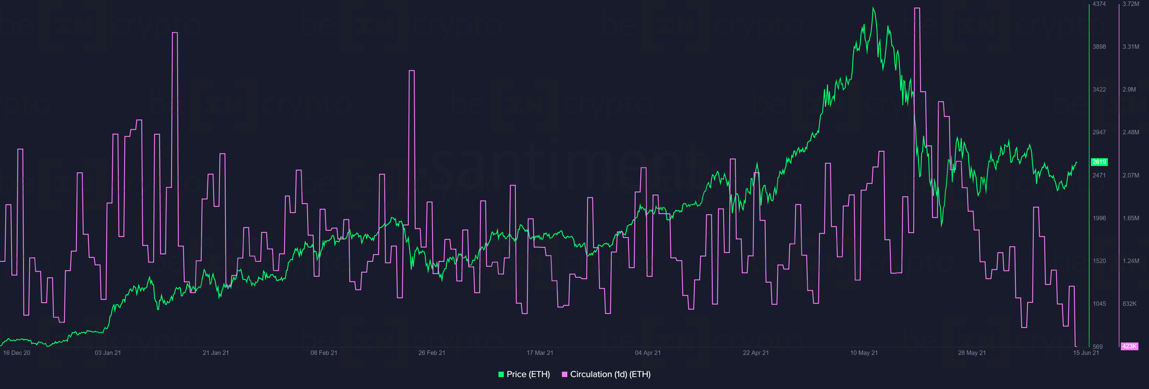 В то же время количество уникальных ETH, ежедневно перемещающихся в сети, упало до 6-месячного минимума. Теперь это число составляет 607 тыс. ETH в сутки.
