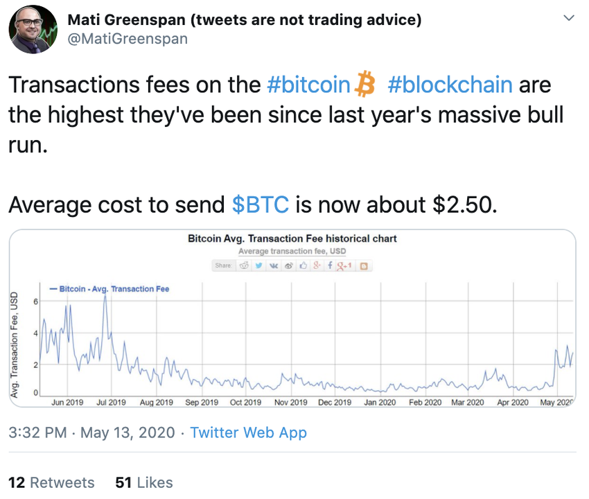 SponsoredОднако в конце апреля ситуация стала меняться и комиссии поползли вверх. Эта тенденция сохранилась и в мае. Более того, даже после того, как халвинг состоялся, разворота пока не произошло. На момент написания статьи средняя комиссия за биткоин-транзакции составляла около $2.76.