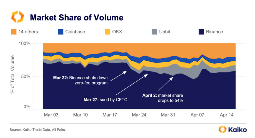 Возврат комиссий ударил и по рыночной доле Binance. Биржа за считанные дни растеряла 20%-ную рыночную долю, которую она накапливала за семь месяцев. При этом высвободившаяся рыночная доля, как полагают в Kaiko, перешла не американской бирже Coinbase, а, на удивление, южнокорейской бирже Upbit.