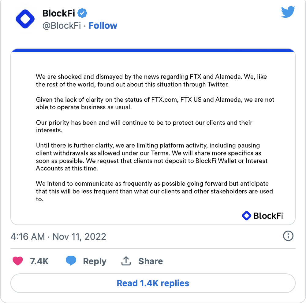 В сообщении для клиентов BlockFi объявила, что «не может вести бизнес в обычном режиме» из-за отсутствия ясности в отношении FTX, FTX.US и Alameda.
