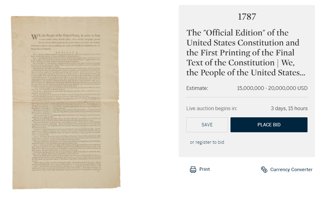 Аукционный дом Sotheby’s намерен продать первое печатное издание конституции США за ценник от $15 млн до $20 млн