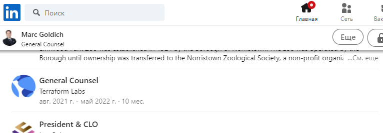 Штатная юридическая команда при Terraform Labs покинула проект на фоне коллапса экосистемы. Профили LinkedIn генерального юрисконсульта Terraform Labs Марка Голдича и других юристов указывают на то, что специалисты прекратили работу в компании в мае 2022 года, менее чем через год работы в компании.
