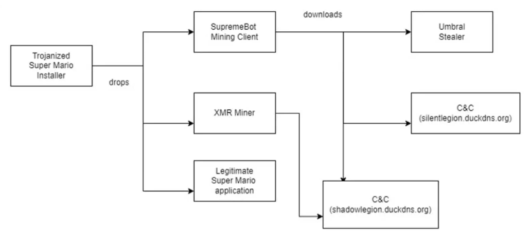 В установочном архиве содержится три файла: один устанавливает саму игру (super-mario-forever-v702e.exe), а еще два (java.exe и atom.exe) скрытно размещаются в папке AppData жертвы во время установки игры. Как только вредоносные файлы спрятаны в папке жертвы, установщик видеоигры открывает их для запуска майнера криптовалютны monero (XMR) и майнинг-клиента SupremeBot, утверждают аналитики.
