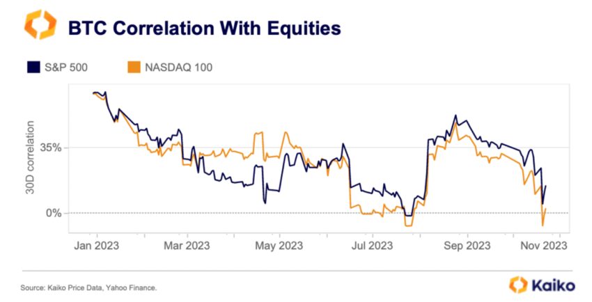 На 30 октября корреляция первой криптовалюты с индексом S&P 500 составила -0,7, а с Nasdaq Composite — -0,69. Такая динамика указывает на то, что BTC получает все более широкое признание на мировом рынке.