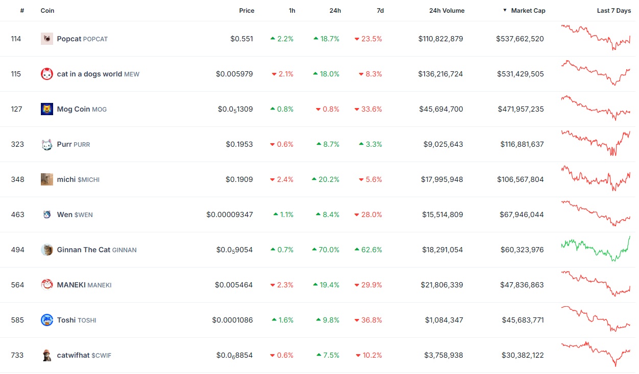 В топ-10 самых капитализированных кото-монет, помимо cat in a dogs world и Popcat, также входят Mog Coin (MOG), Purr (PURR), Michi ($MICHI), Wen ($WEN), Ginnan The Cat (GINNAN), Maneki (MANEKI), Toshi (TOSHI) и Catwifhat ($CWIF).