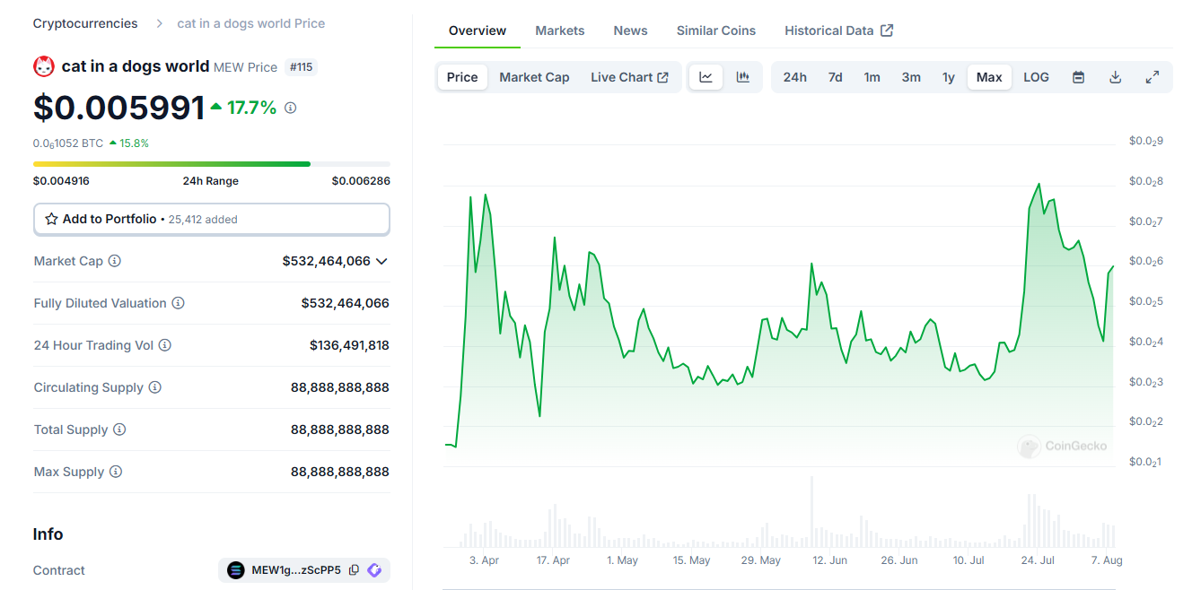 Монета cat in a dogs world находится на 115 месте в общем рейтинге капитализации ресурса CoinGecko. Максимум стоимости криптовалюты зафиксирован 31 марта 2024 года на уровне $0,009716.