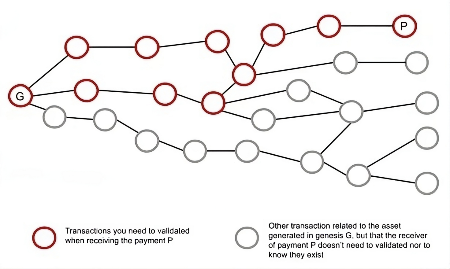 RGB, с другой стороны, не полагается на глобальную сетевую трансляцию всех транзакций для создания эквивалента набора UTXO Биткоина. Это означает, что при получении входящего платежа клиент RGB должен не только убедиться в достоверности последнего перехода состояния, но также должен выполнить проверку для всех предыдущих переходов состояния до исходного состояния в эмиссионном контракте. Эта восходящая проверка истории транзакций в RGB защищает от атак двойного расходования.