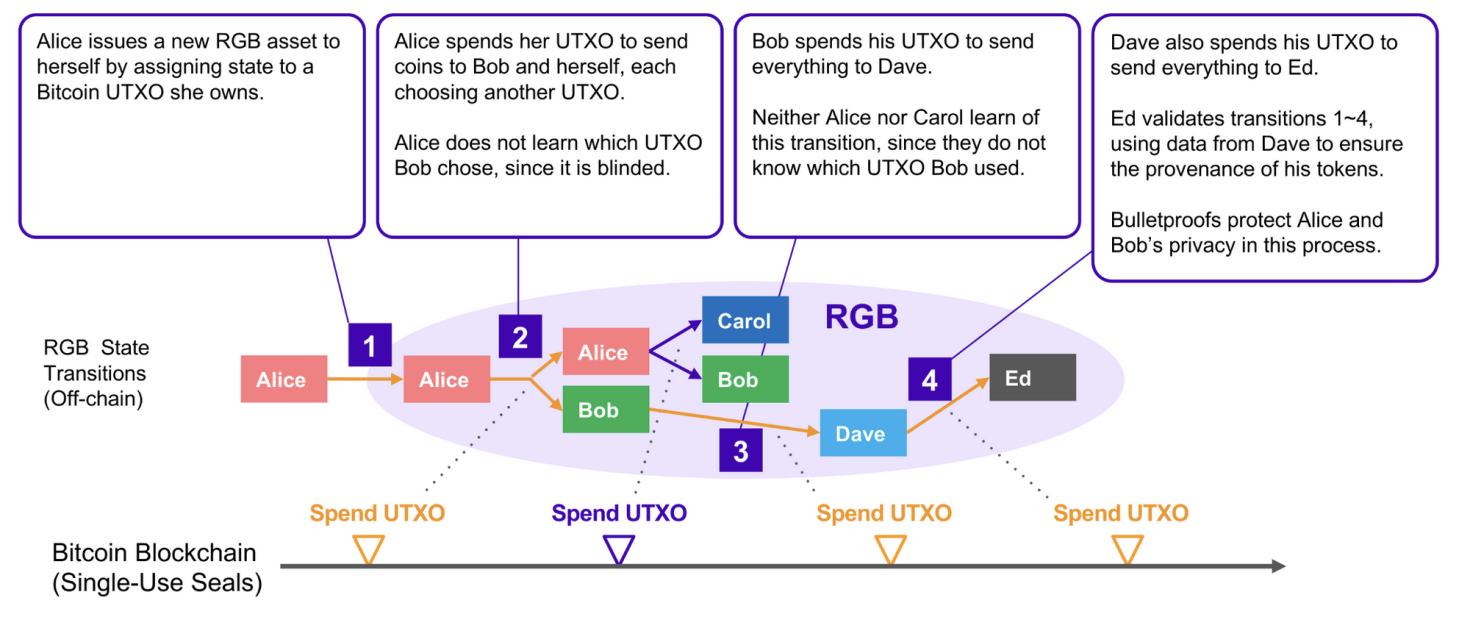 RGB использует описанную выше модель одноразовой печати на базе Биткоина, то есть при совершении RGB-транзакции отправитель создает переход состояния контракта, определяющего передаваемые права. Рассмотрим случай с токенами. Во-первых, эмитент контракта устанавливает исходное состояние, которое определяет детали контракта, такие как имя актива, общее предложение и UTXO с правом перемещения предложения. Затем, когда активы впервые передаются, владелец первого UTXO может создать переход состояния, который определяет, какой новый UTXO теперь будет владеть активом. RGB достигает переходов состояний, используя механизм, согласно которому UTXO можно потратить только один раз, что позволяет надежно определять и отслеживать передачу криптоактивов и изменения прав собственности.