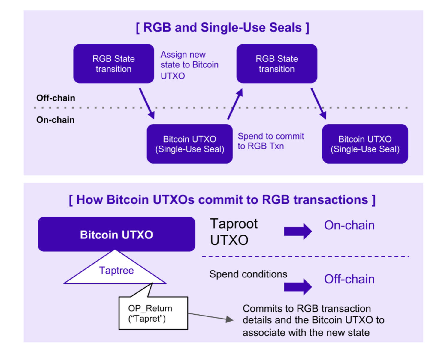 Вместо того чтобы использовать доверенное лицо для подтверждения открытия и закрытия цифровых печатей, в качестве печатей можно использовать неизрасходованные выходы транзакций Биткоина (Unspent Transaction Outputs, UTXO). UTXO можно рассматривать как печать, которая закрывается при создании и открывается при расходовании. В соответствии с правилами консенсуса Биткоина вывод может быть потрачен только один раз, следовательно, и печать может быть открыта только один раз. Таким образом, одноразовые печати используются для привязки UTXO Биткоина к состояниям контрактов вне цепочки, что позволяет осуществлять переход к следующему состоянию посредством транзакций RGB вне цепочки (закрытие печати). Подобно физическим одноразовым пломбам, используемым для защиты грузовых контейнеров, цифровая одноразовая печать представляет собой уникальный объект, который точно запечатывает часть информации для предотвращения двойной траты.
