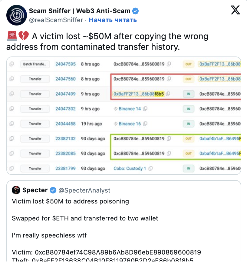 Криптовалютный трейдер лишился активов на сумму $50 млн в стейблкоинах USDT. Причиной стала изощренная атака, известная как «отравление адреса» (address poisoning).