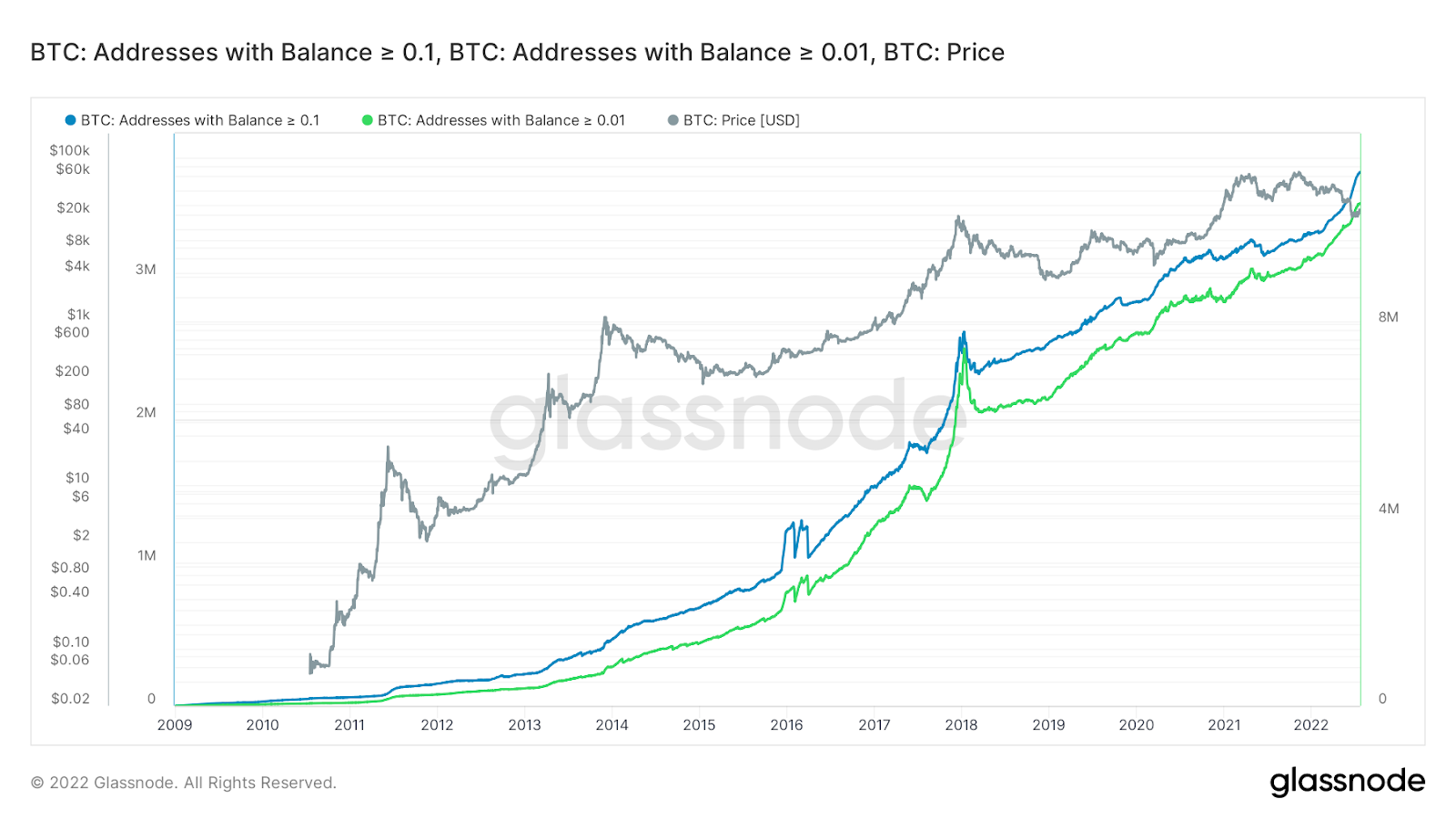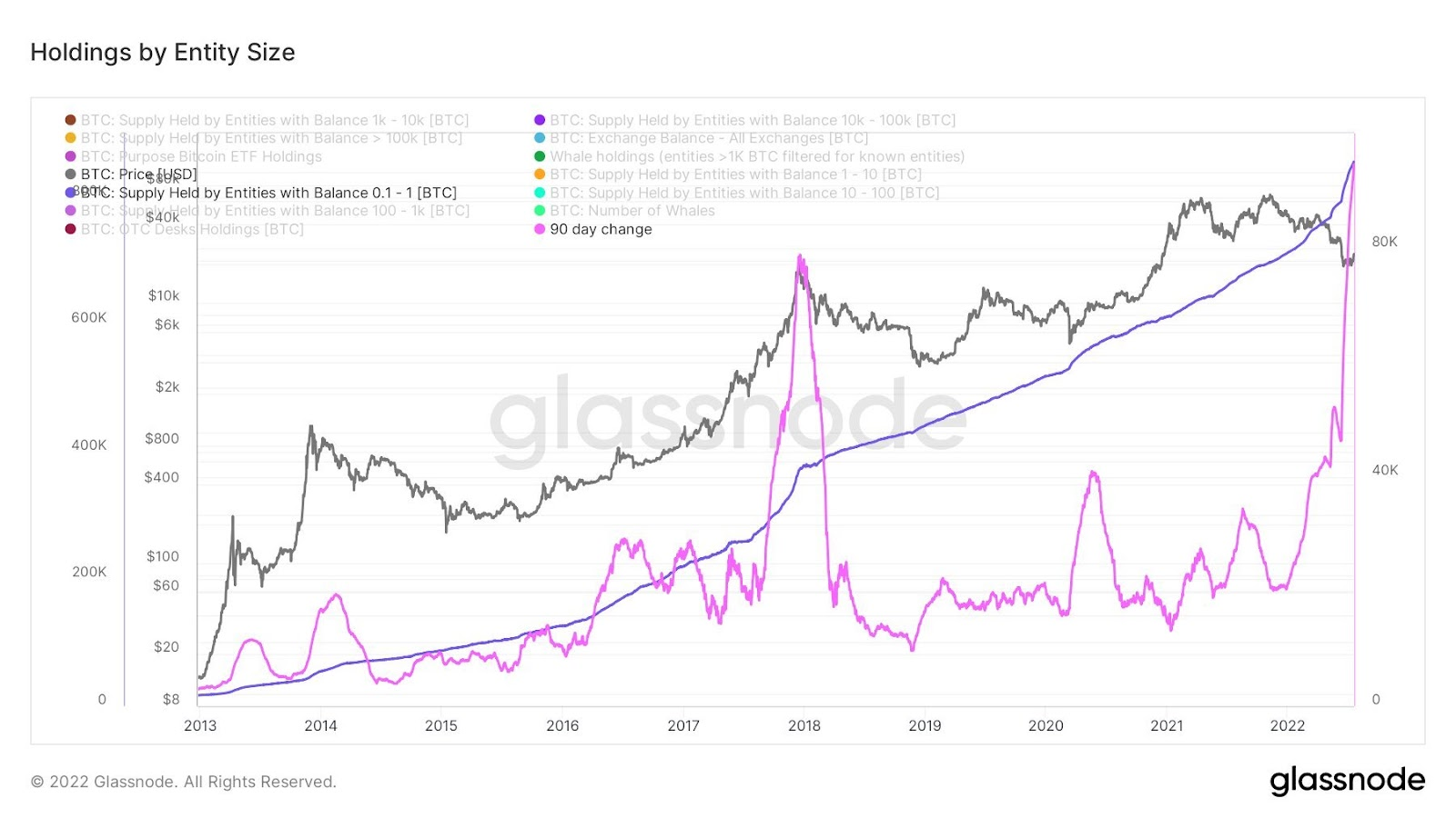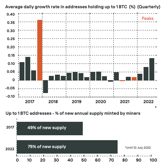 Однако в середине июня 2022 года этот тренд ускорился. Во время предыдущих рыночных циклов такая динамика в сети биткоина указывала на разгон бычьего рынка. Напротив, во время крупных рыночных коррекций ончейн-анализ, как правило, указывал на небольшое увеличение, стагнацию или даже снижение количества адресов с балансом менее 0,1 BTC.