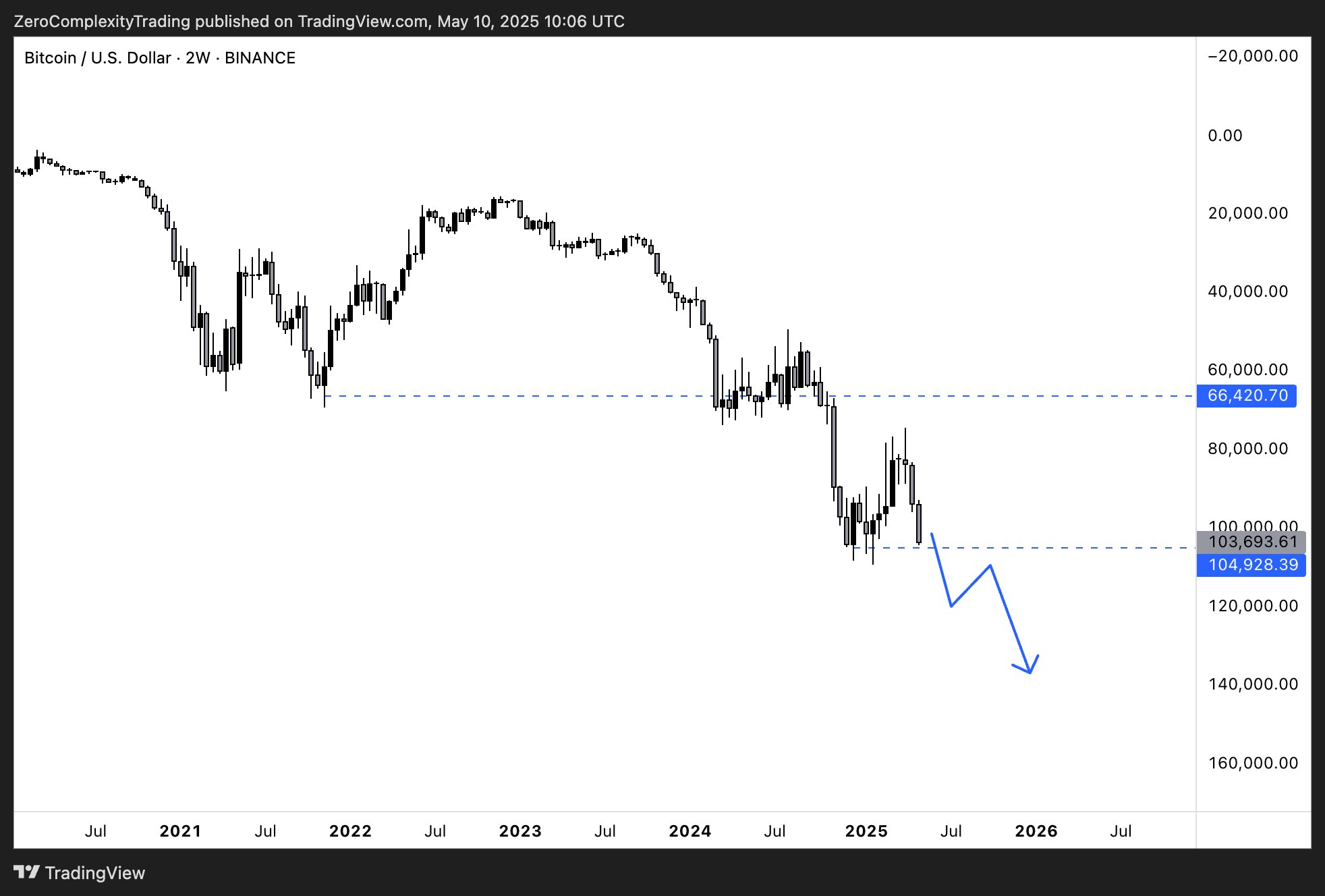 Также участники криптосообщества обращают внимание на теханализ. Иногда, чтобы понять особенности положения актива, достаточно перевернуть его график. Смена парадигмы позволяет увидеть то, что ранее было скрыто от глаз. Так поступил криптотрейдер @KoroushAK. Он опубликовал крайне «медвежий», на первый взгляд, график биткоина, на котором отчетливо виден нисходящий тренд. Трейдер обозначил предположительную траекторию его продолжения. «Проблема» лишь в том, что на самом деле график перевернут, а значит на самом деле тренд — бычий.