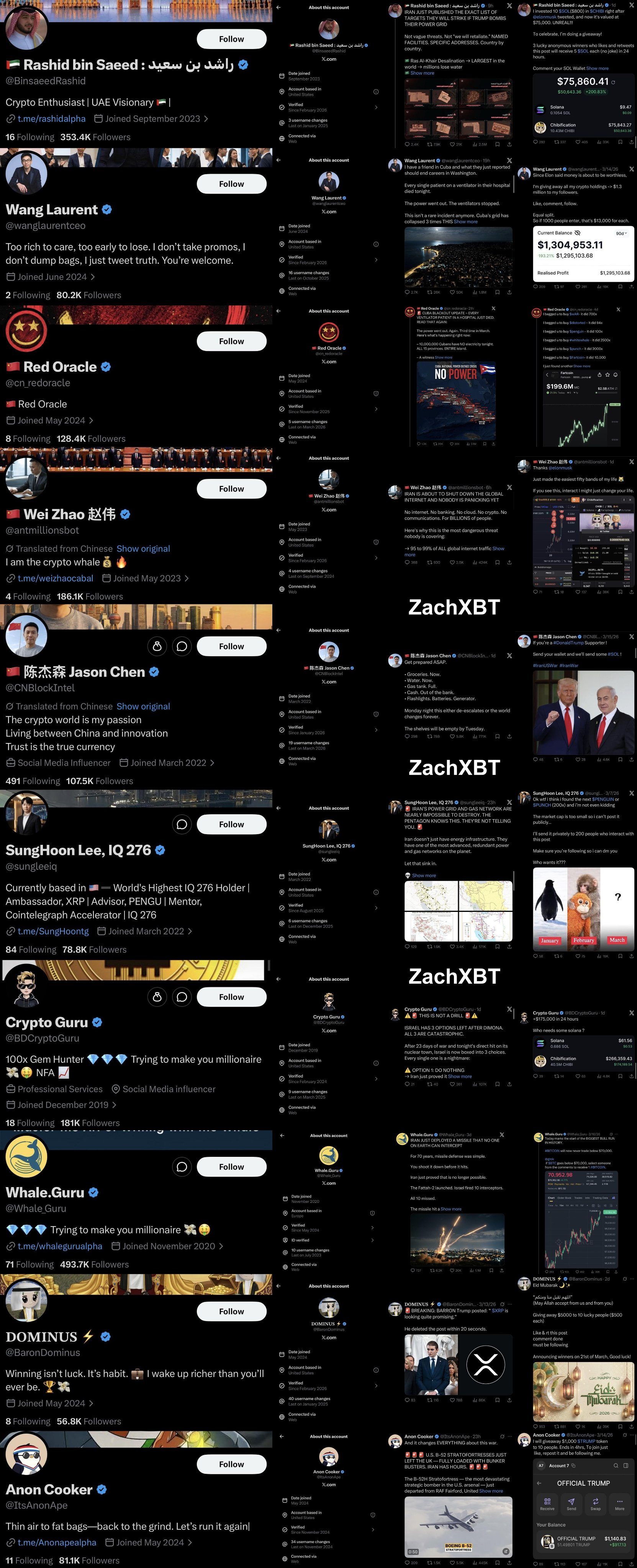 Блокчейн-расследователь ZachXBT выявил координированную сеть из более чем десяти аккаунтов в X (бывший «Твиттер»). Аккаунты публиковали тревожные посты о войне и политике и искусственно разгоняли их до миллионов просмотров.