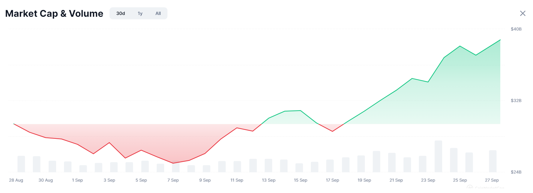 Так, капитализация сектора за последние 30 дней значительно выросла — с $29 млрд 28 августа до $38 млрд на момент написания, 27 сентября.
