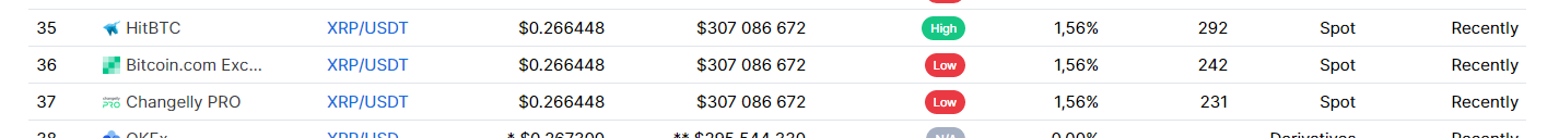 Криптовалютные биржи массово участвуют в отмывочной торговле токеном XRP. По крайней мере об этом свидетельствуют идентичные данные объема торгов на coinmarketcap.com.