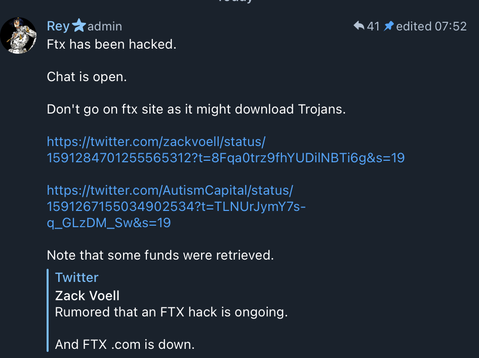 Информация о взломе появилась в официальном телеграм-канале биржи. Администратор канала посоветовал не заходить на сайт и в мобильное приложение FTX