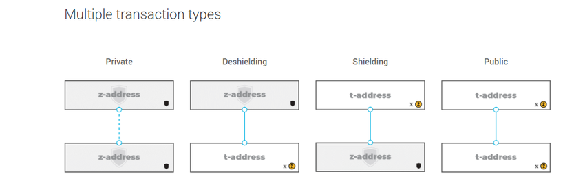 Технология zk-SNARKs позволяет осуществлять операции с Zcash как с прозрачных, так и с защищенных адресов, в зависимости от используемого кошелька. Приватные адреса начинаются с буквы “z”, а прозрачные – с “t”. Когда происходит перевод денег на защищенный адрес, получаемая сумма на каком-то этапе словно проваливается в «черную дыру». Сторонние наблюдатели не могут увидеть ни размер средств на этом кошельке, ни сам адрес.
